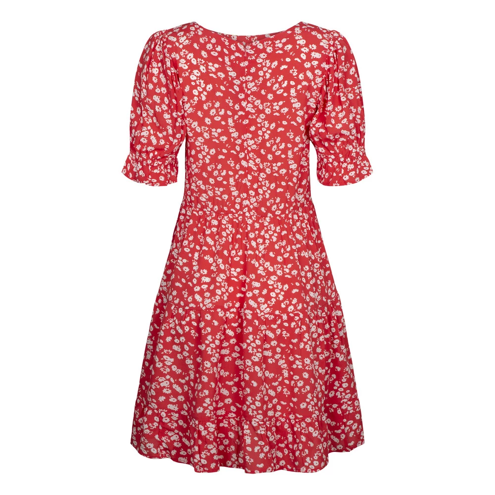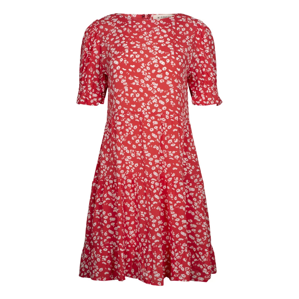 Vivian Dress fra MISSMAYA. Si hei til vårt nye merke MISSMAYA – vakre kjoler med flatterende snitt og god passform. Vivian Dress er en av MISSMAYAs bestselgere, og det er ikke uten grunn. Kjolen har rynkesøm i midjen og strikk i ryggen som gir en fantastisk fin og flatterende passform. Vivian Dress har korte ermer med puff, rund hals og fine volanger på skjørtet, og lukkes med glidelås i ryggen. Den perfekte sommerkjolen i en lekker dus lilla med hvite blomster.Materiale: 100% crepe viskose