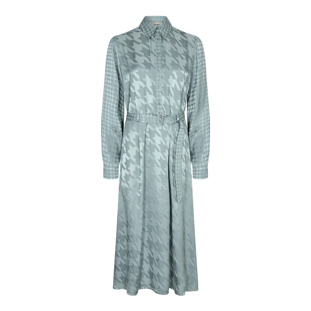 Super fin kjole fra Mos Mosh med et fint mønster og deilig luksuriøs kvalitet. Kjolen har også en fin skjortekrage i halsen, brede mansjetter rundt håndleddene og et fint matchende belte til midjen. Den lukkes langs fronten med små knapper. · Fit: Allmight to Lett Loose -Fitting · Dimensions: Str. 34: Brystdimensjoner: 43 cm. x 2. Lengde: 126 cm. · Modell: Tamana Alia Dress Dresses 145290 Lead · Kvalitet: 100% Viscose · Vask: 30 grader Skåne Wash