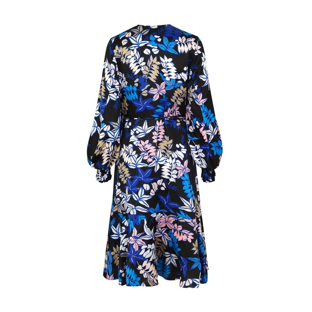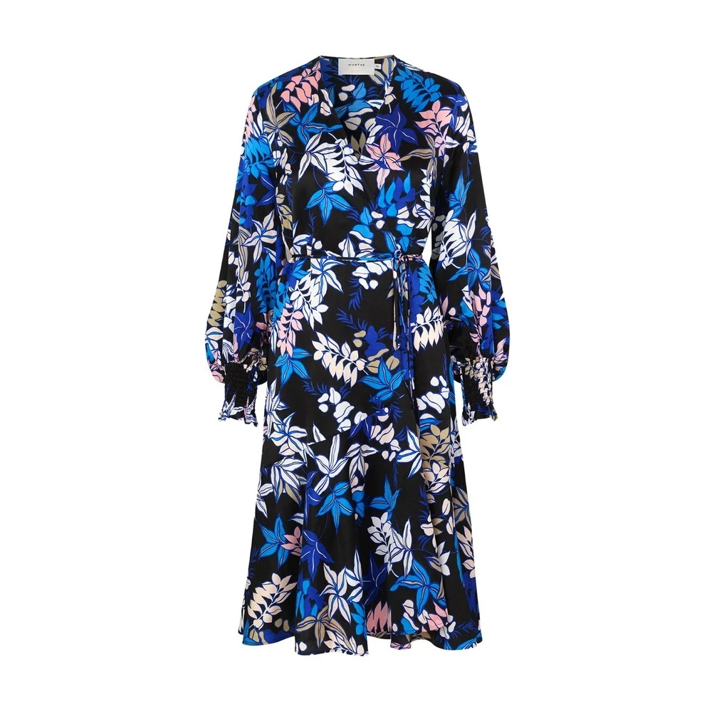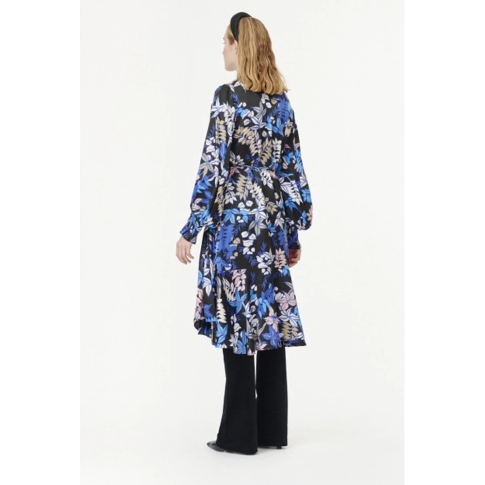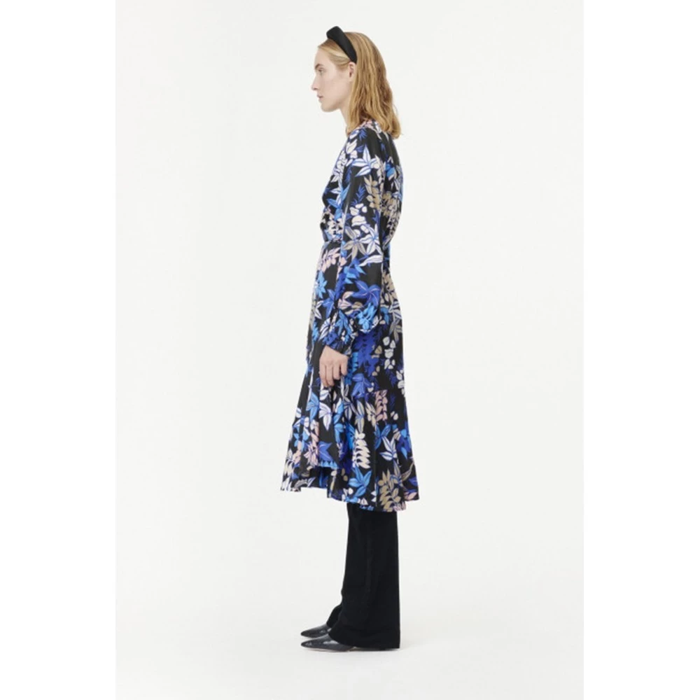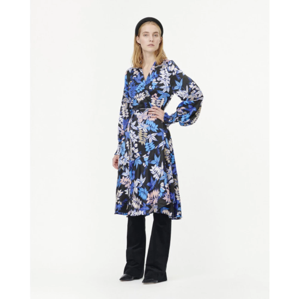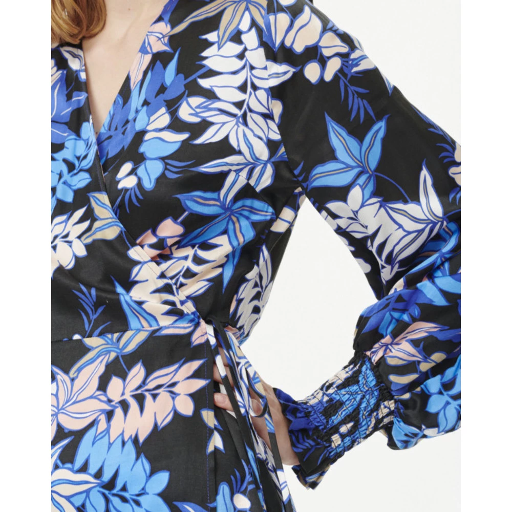 Elegant omslagskjole i viskose med blomsterprint. Kjolen har v-hals og litt volum i armene. Den er tøff med sneakers og pyntet med heler. Kjolen kan krype litt ved vask