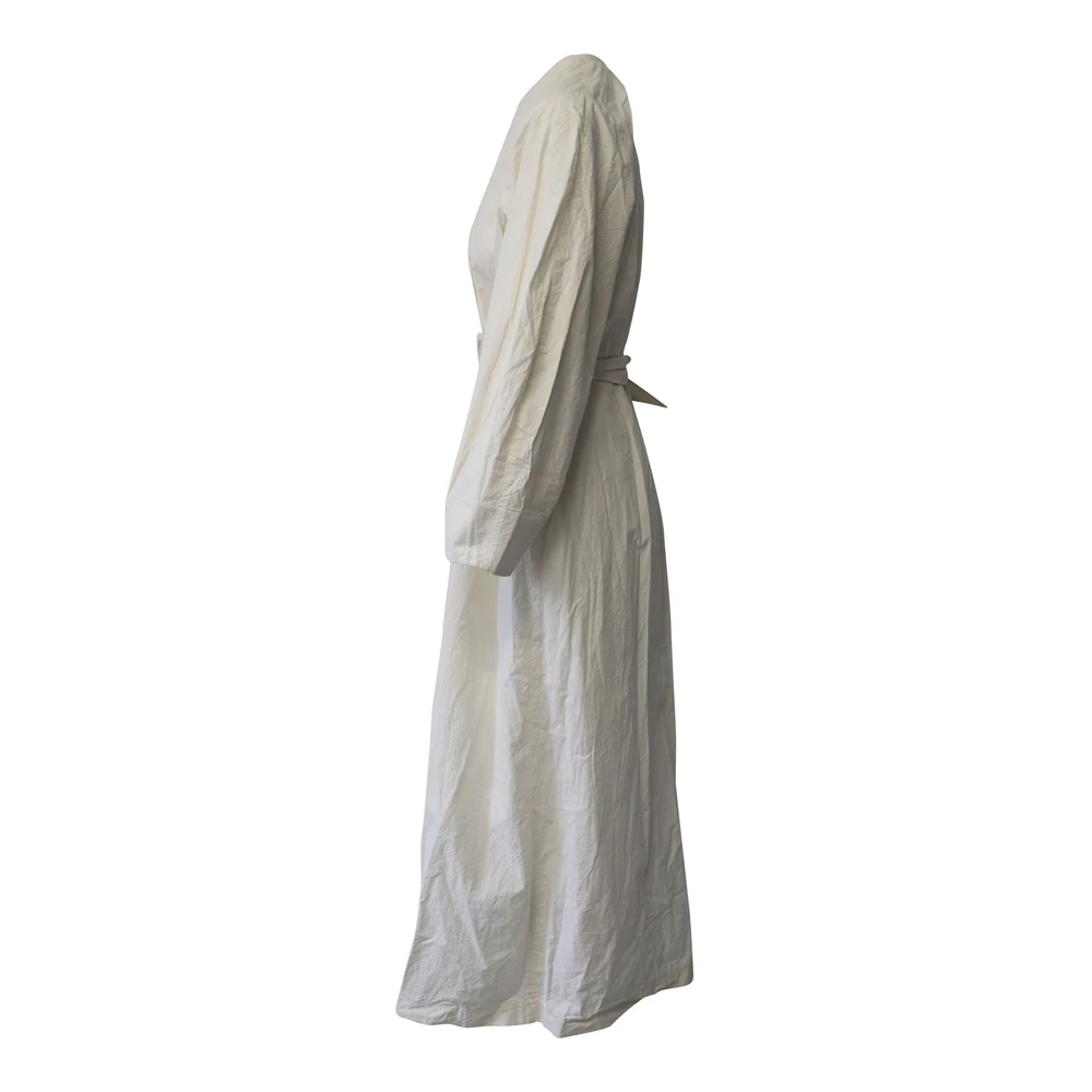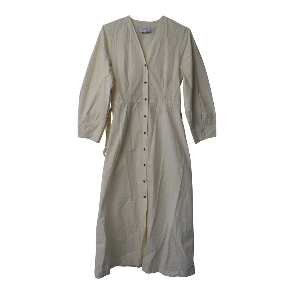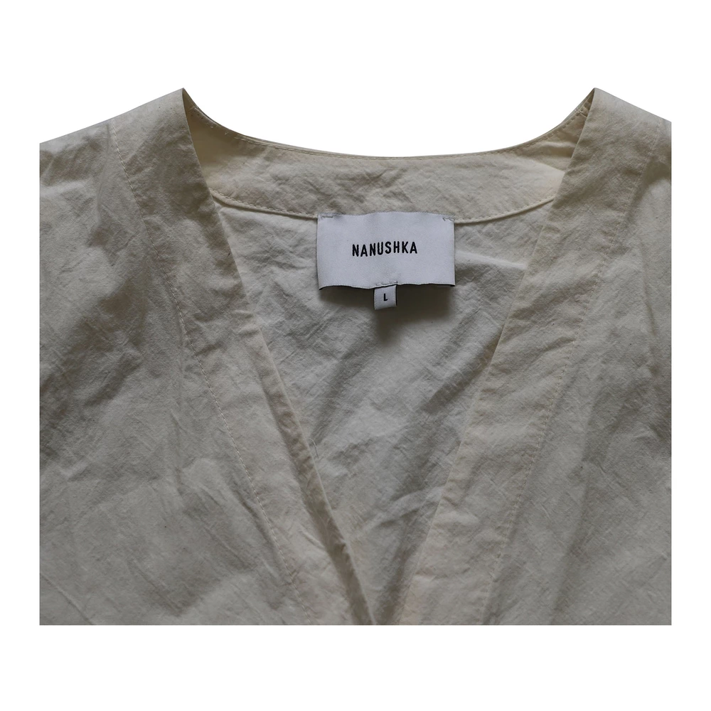 Femme -kjolen fra Nanushka er et raffinert utseende for den moderne kvinnen. Laget av off-white bomull, har den beltede designen en V-hals som fører inn i snap-knapper som har en kunstnerisk, marmorert finish. Hele ermene gir et snev av volum og A-Line Midi-skjørt parer vakkert med muldyr i nøytrale fargetoner. Nanushka femme maxi kjole med belte i hvit bomullstilstand: Utmerket materiale: Bomullsstørrelse: L Sign of Wear: No SKU: 188634