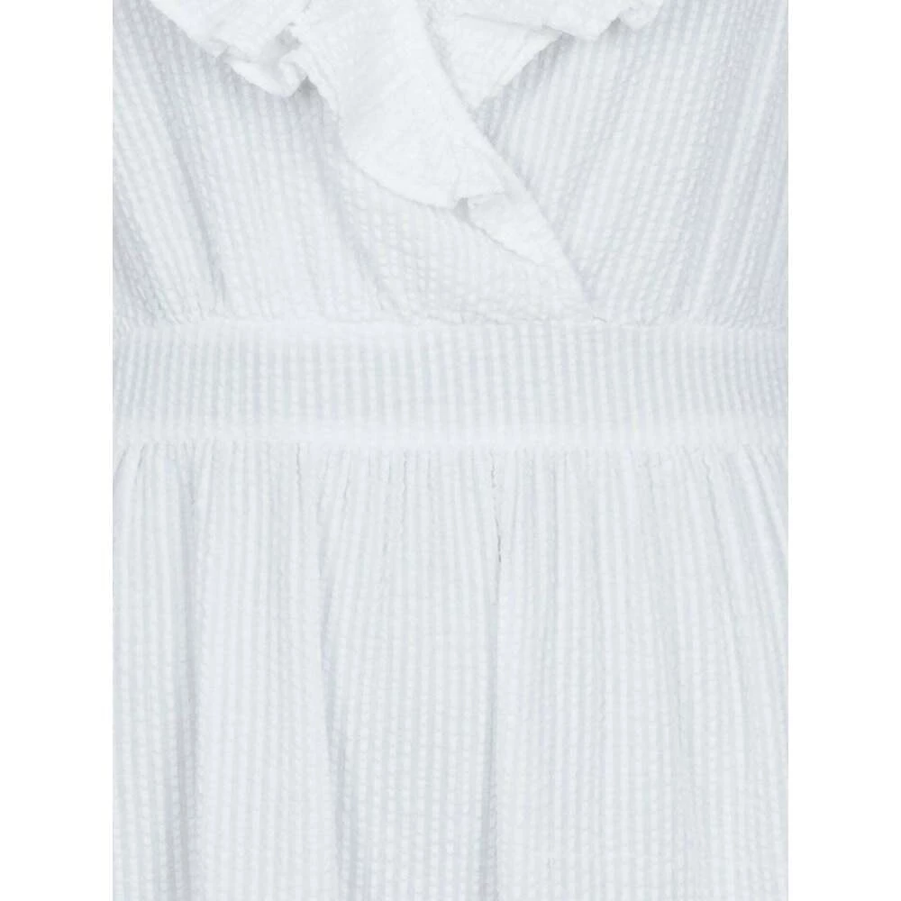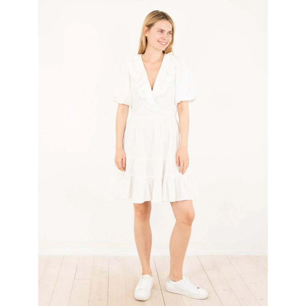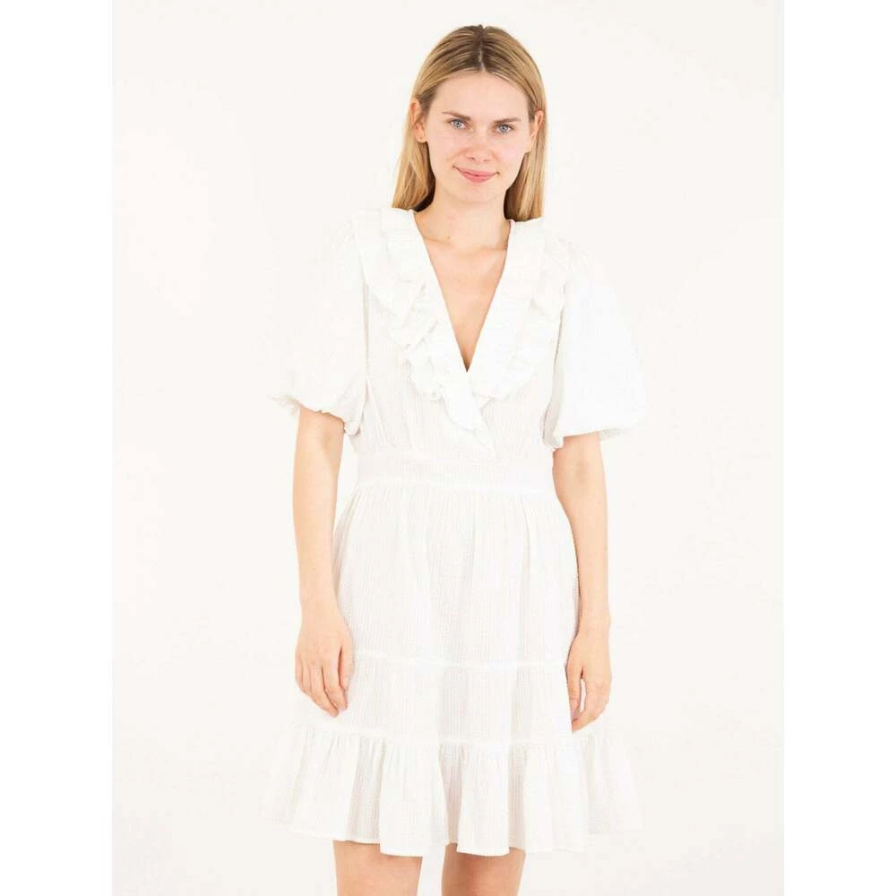Erika Solid Dress fra Neo Noir. Kjolen har korte, feminine ballonger med puff på skuldrene og V-hals med ruminøse detaljer. Erika Solid Dress har fast midje som gir en superfin fasong, og skjørt med a-fasong og volumkant nederst. Skjær i en myk og luftig crepe.