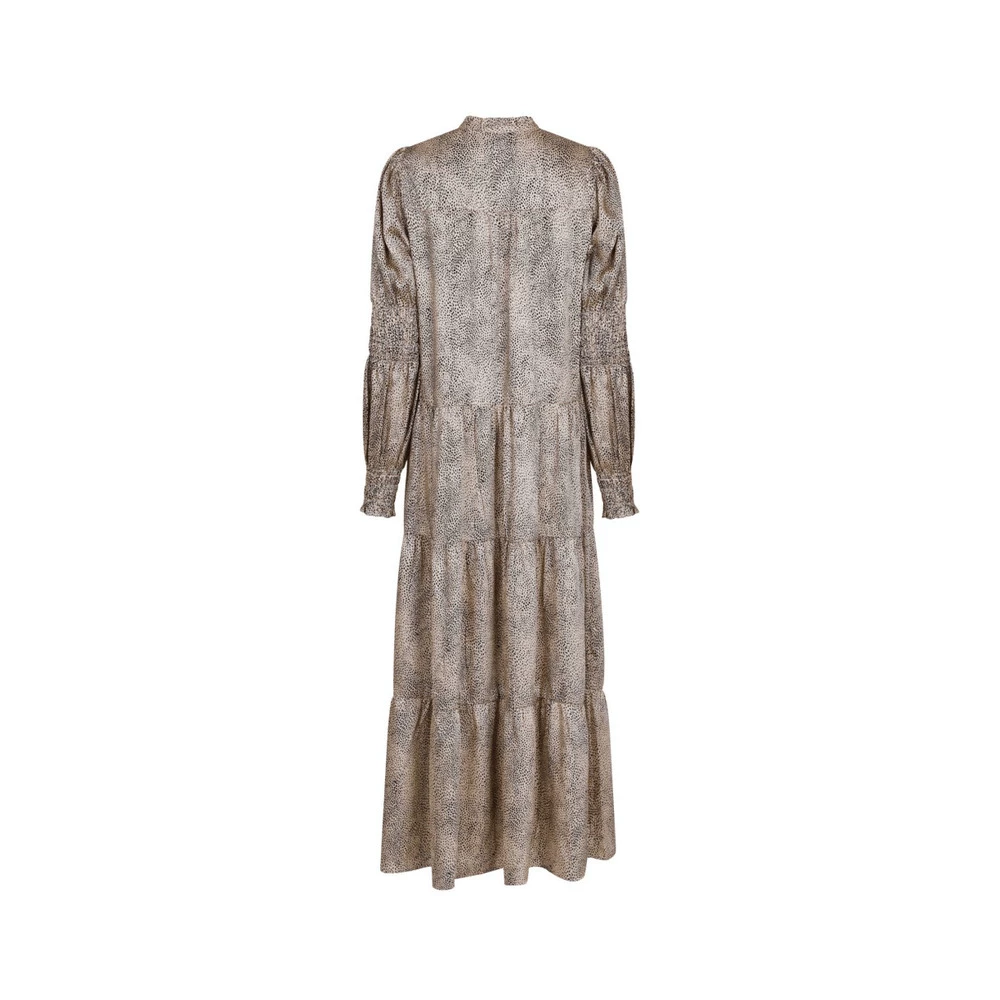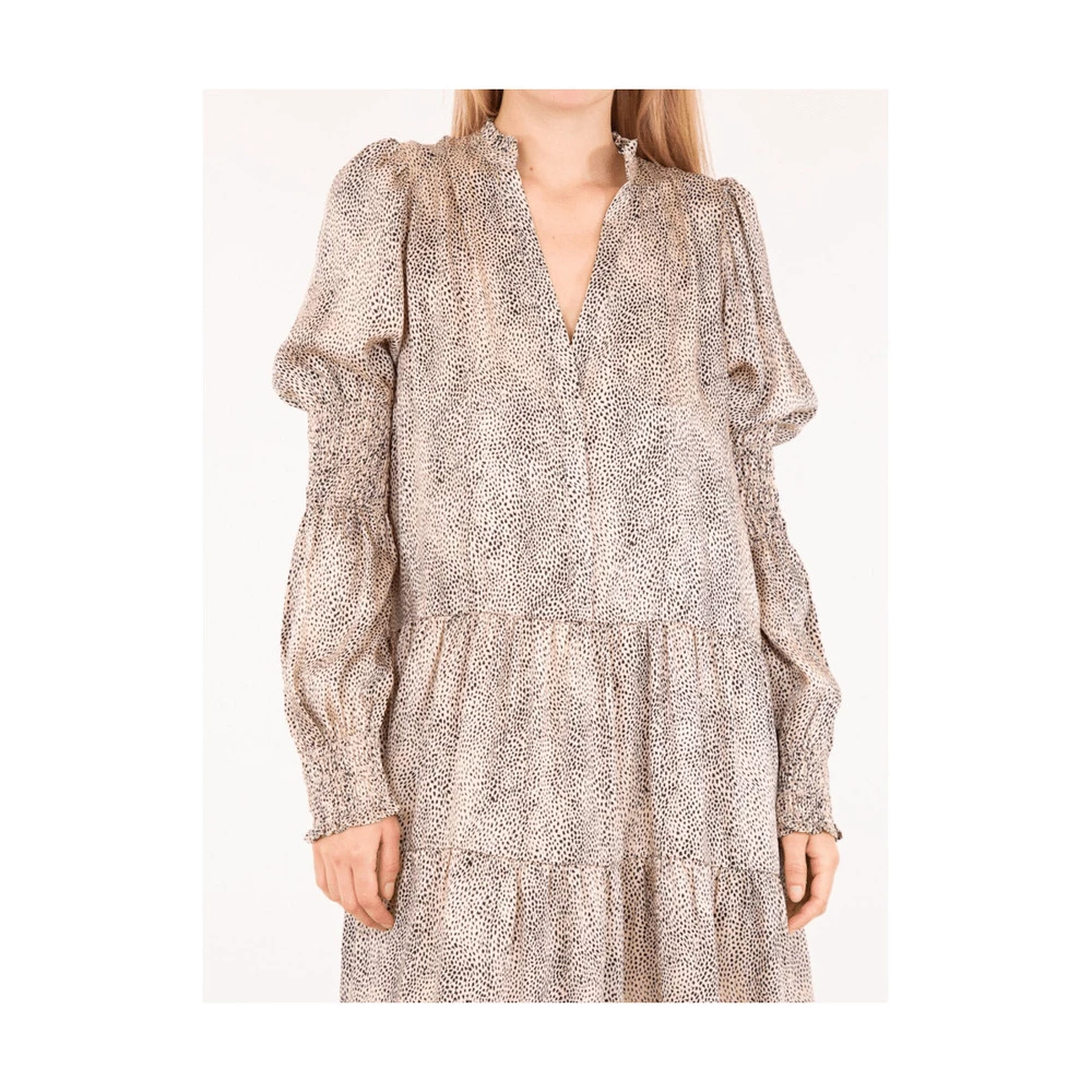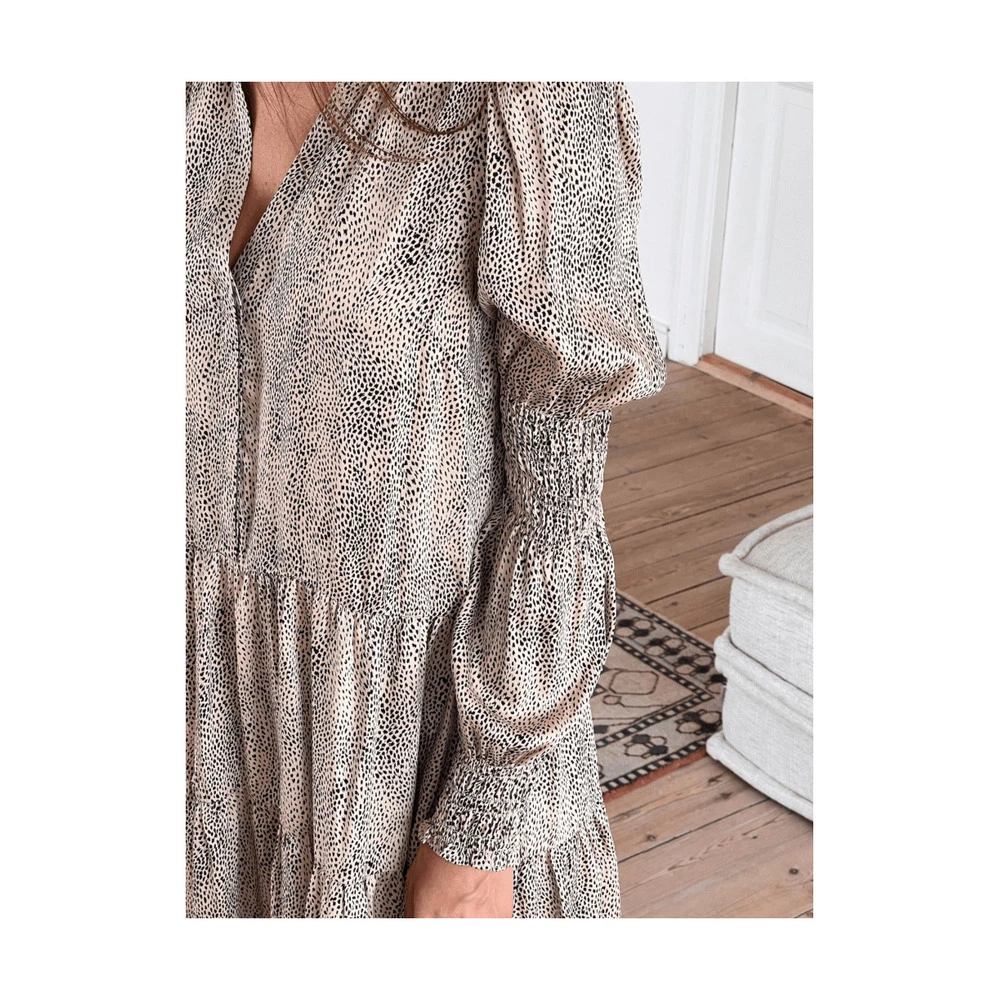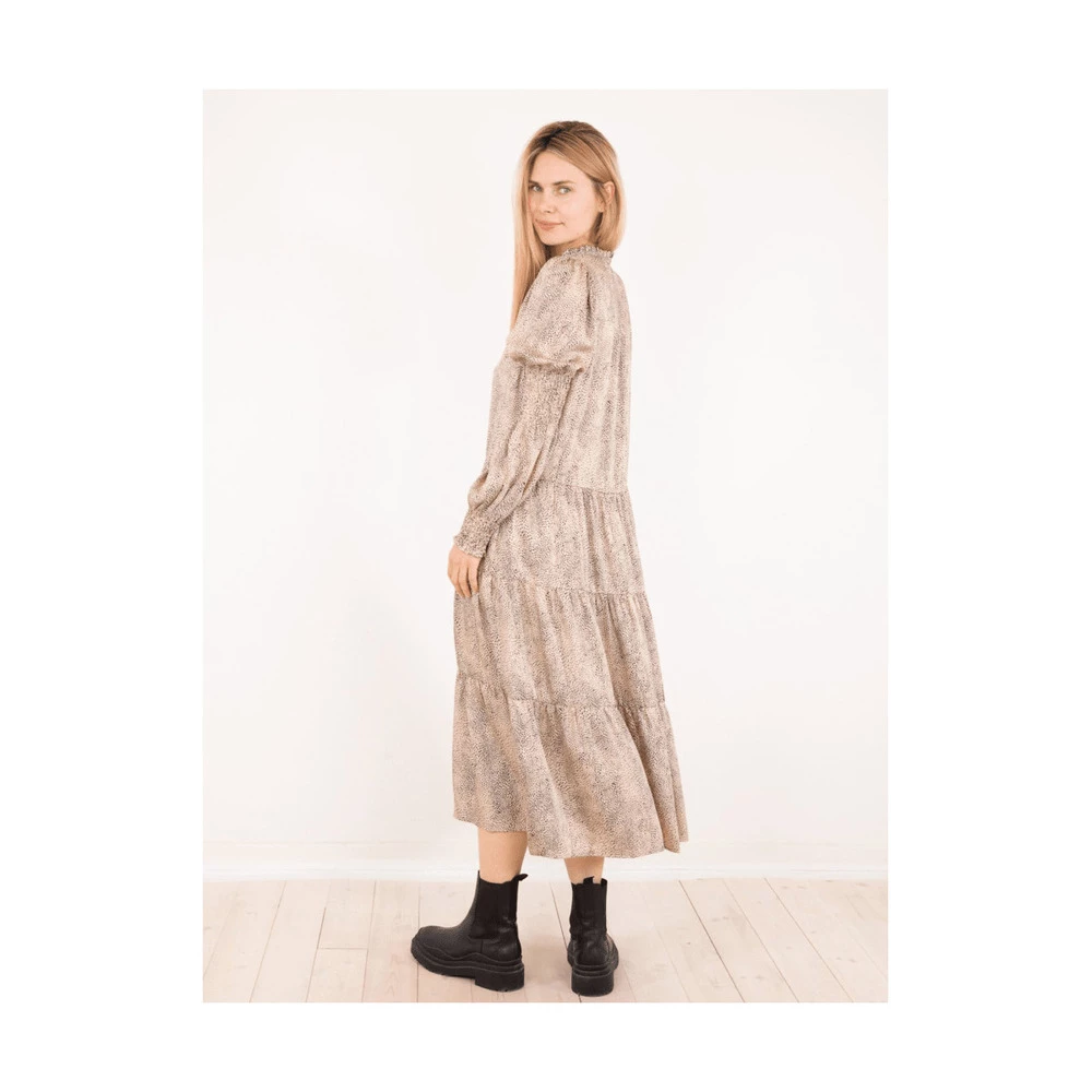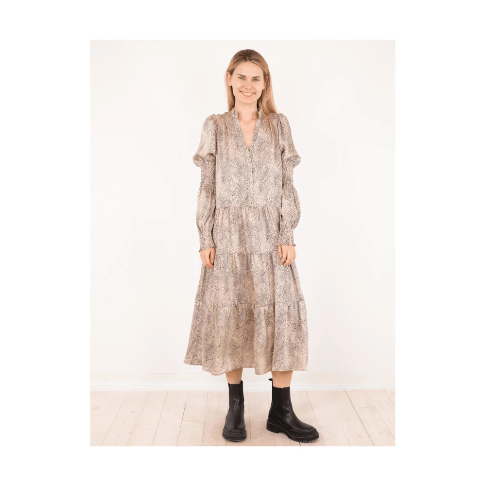 Vakker kjole i fin twill sateng med klassisk abstrakt print. Kjolen har knapper foran og volang nederst. Passformen er semi løs og flatterende. Finnes i denne nydelige lyse fargen og i en mørkere variant.