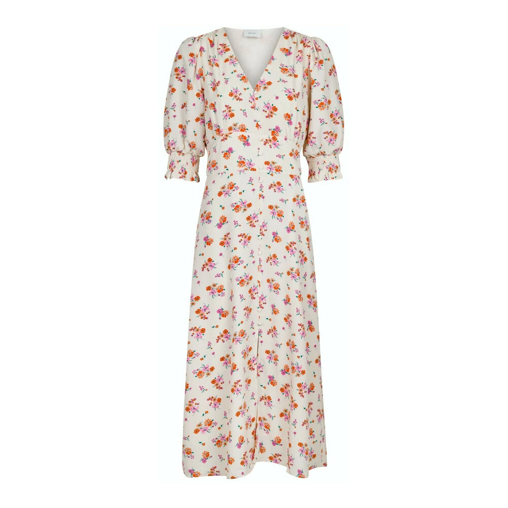 Kjole med puffermer og V-hals. Kjolen har også et lite elastisk panel bak, dekkede knapper foran og et vakkert blomsterprint.