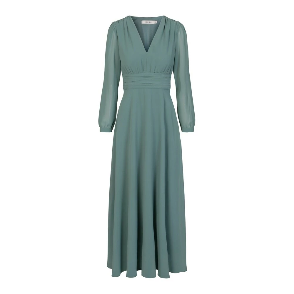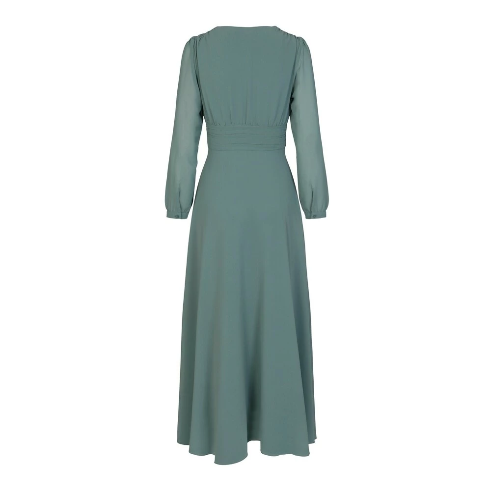 Fotsid kjole med V-hals og lange ermer. Splitt på ene siden. Materiale: 100% polyester Vaskeanvisning: Vaskes for hånd