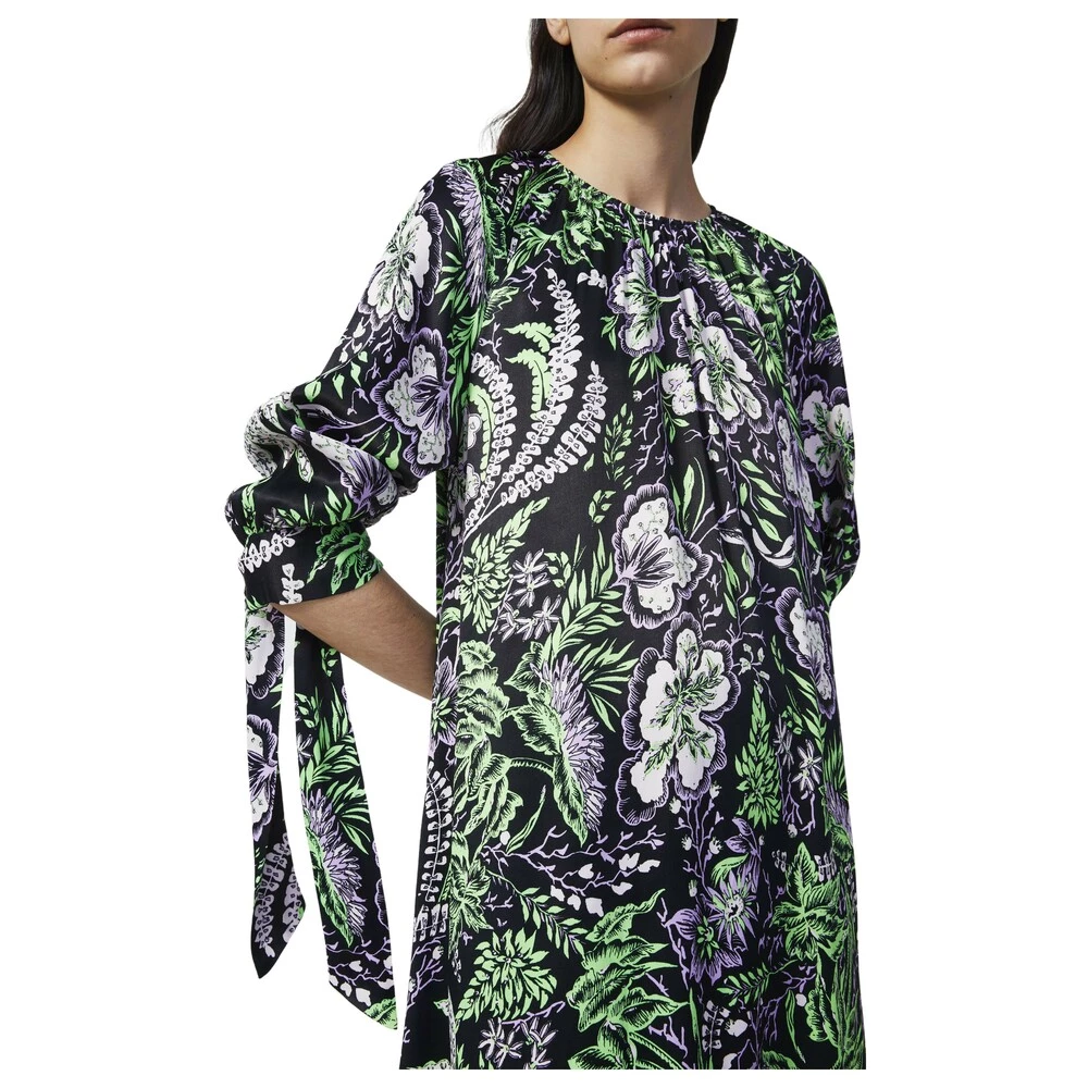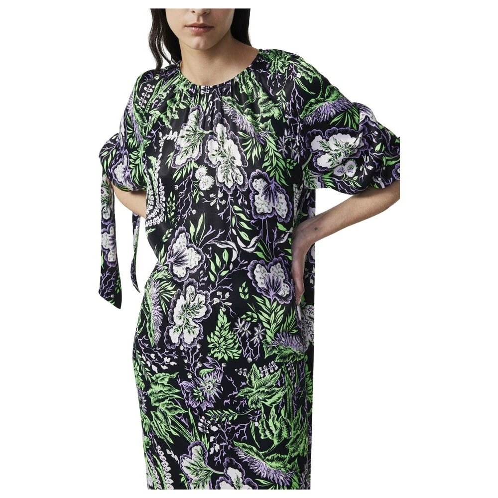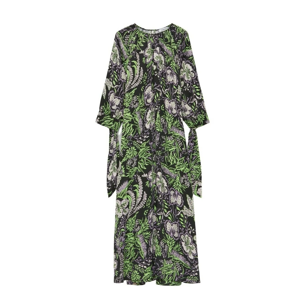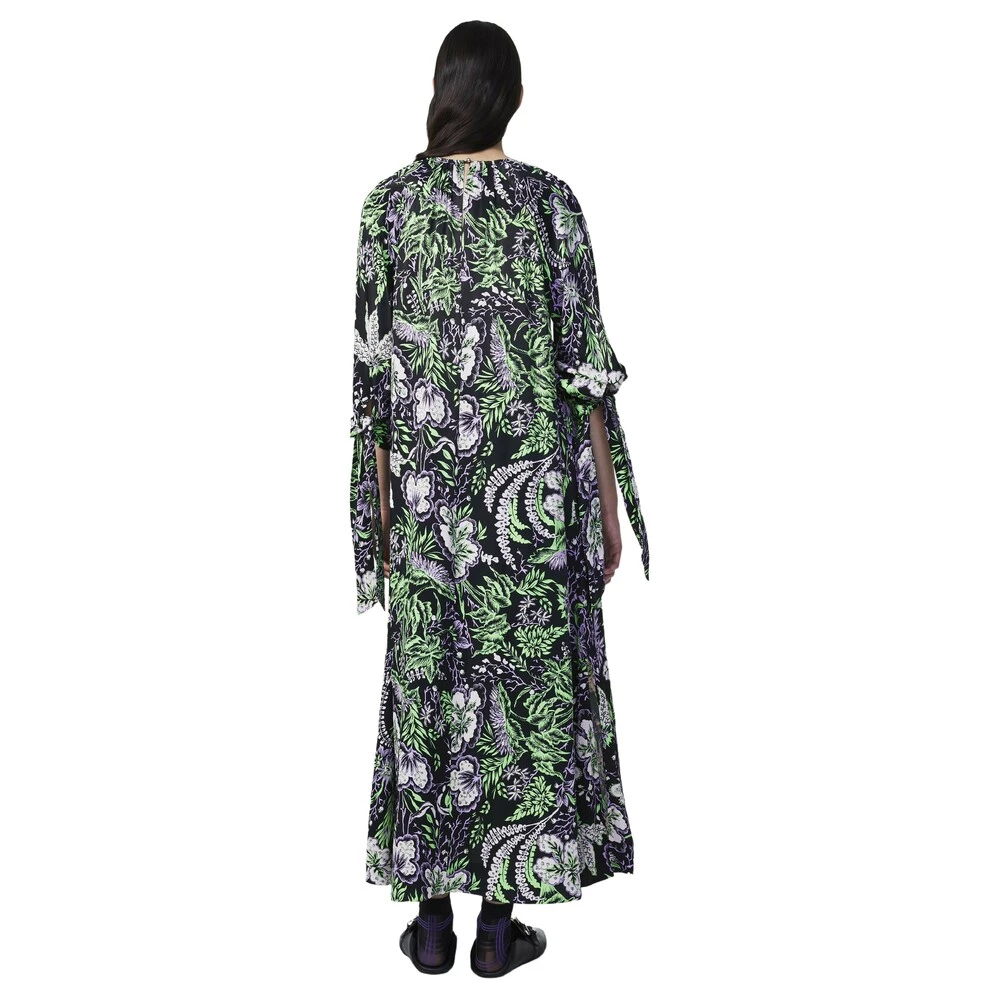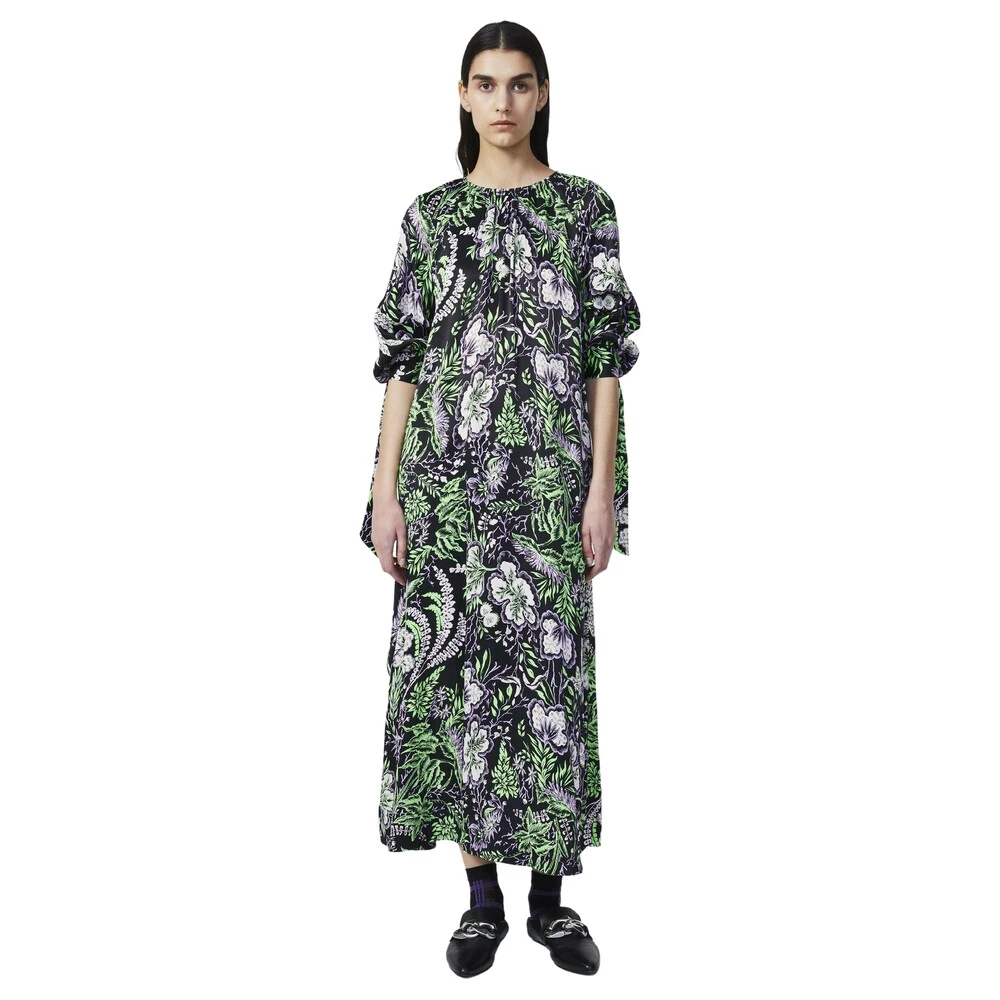 Kjolen har en rund utringning, med knapp og nøkkelhull på baksiden. Kjolen har en løs raglanhylse som har en mansjett med uavgjort detalj. Kjolen er laget i en løs overdimensjonert fi. Det er spalter på hver side av kjolen som gir ekstra bevegelse og gir kjolen er mer flytende utseende. Kjolen er ankellengde og er kuttet fra en fantastisk tung satengviskose.