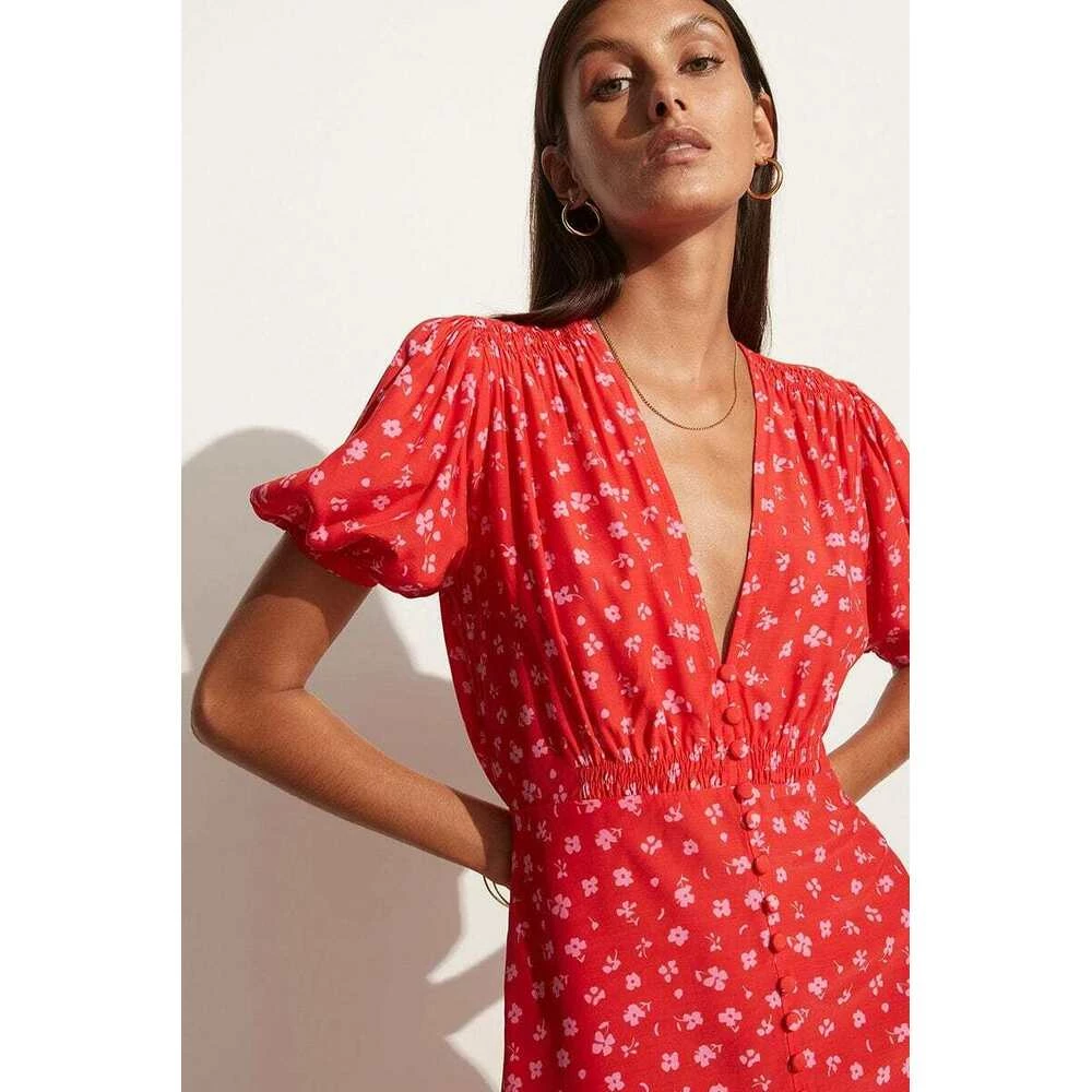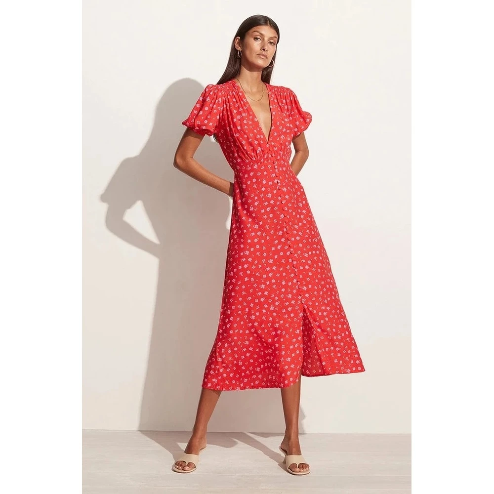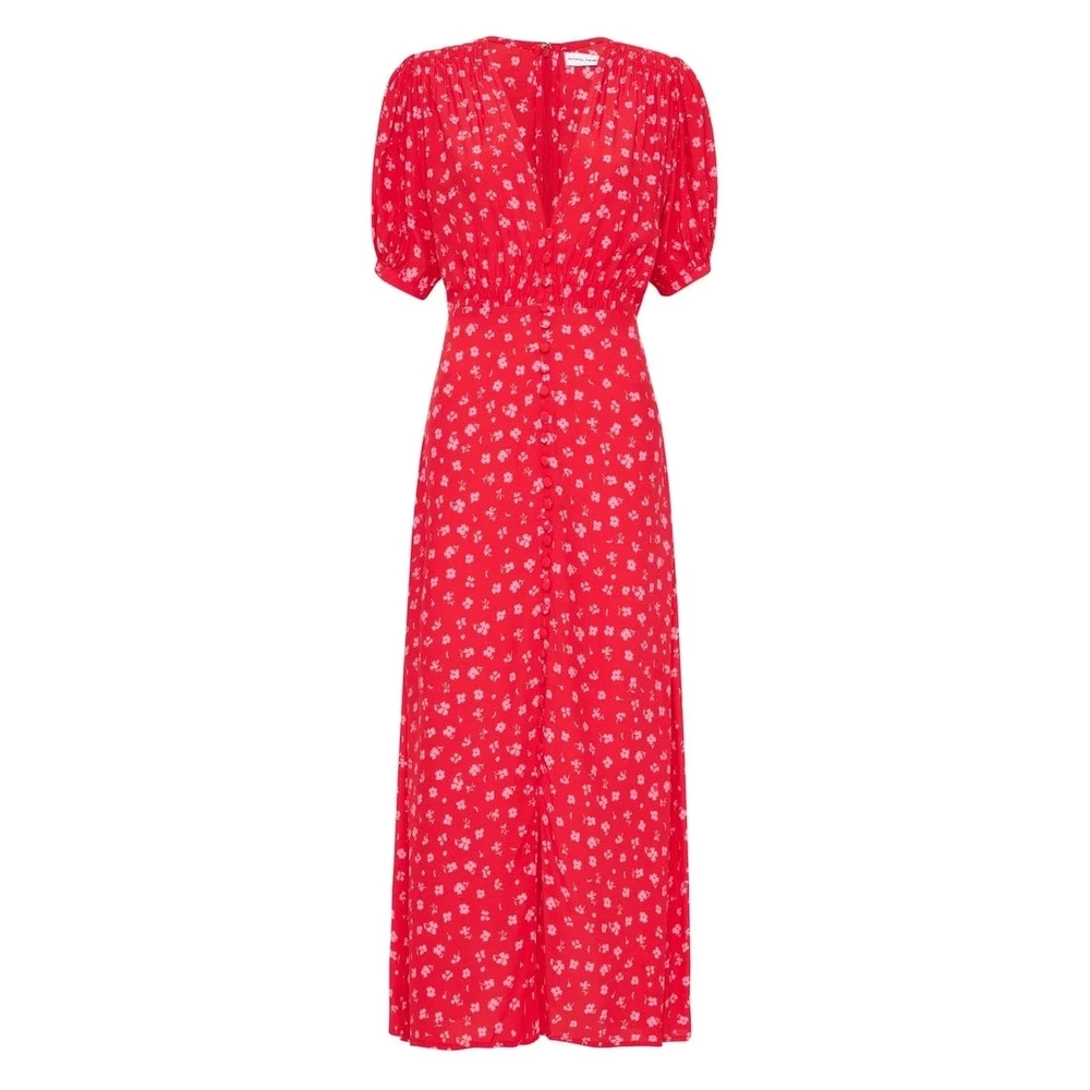 Faithfull The Brand – Bellavista Midi Dress Nydelig kjole i en lett og luftig rayon crepe kvalitet. Modellen er designet med flatterende v-hals, fast midje med knyting, korte puffermer, knapper foran og et flytende skjørt i a-fasong med feminin splitt midt foran. 100% Rayon Crepe