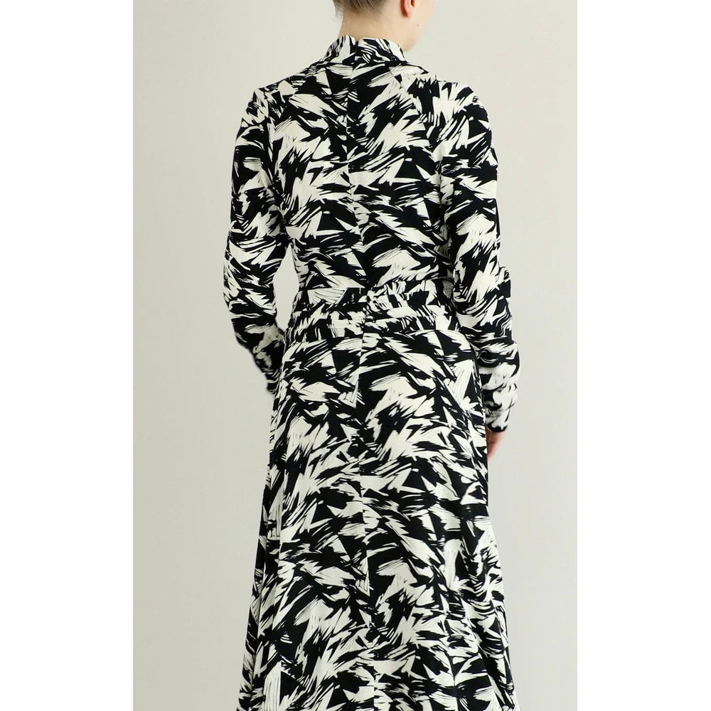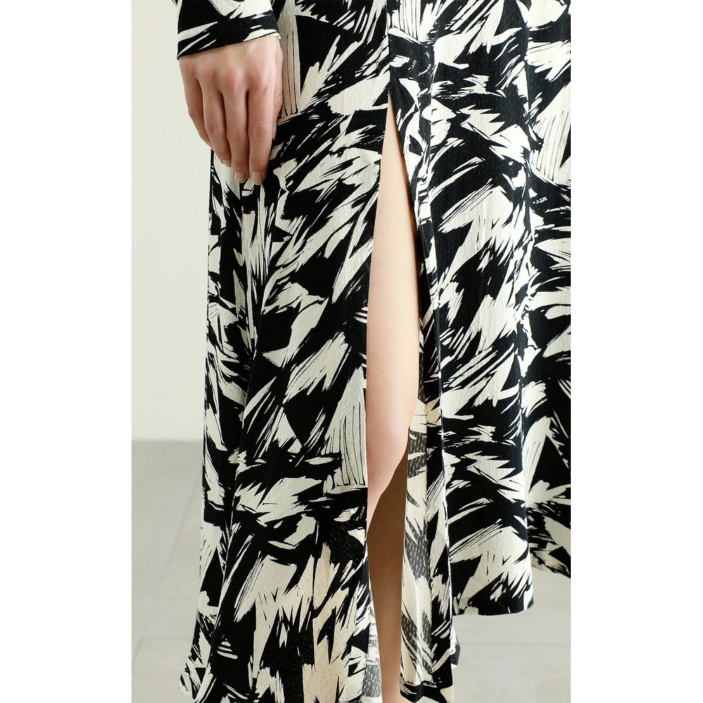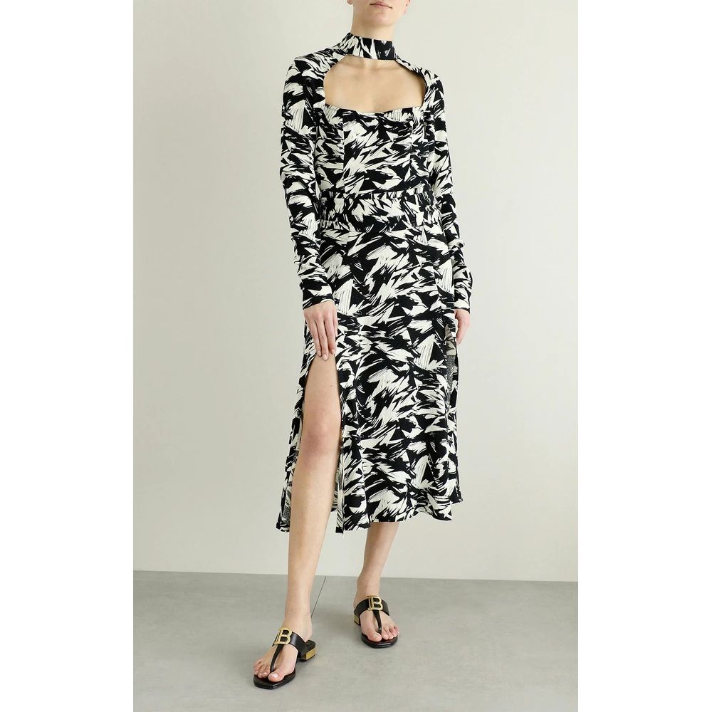 Denne flotte kjolen i svart og hvitt med sin uvanlige silhuett danner en nyhet i Rotate -universet. Kalv -lengde -kjolen har en dyp utringning som ikke kan gli takket være det integrerte gummidekket. De høye sporene på benet og det flytende stoffet trylle frem en flott kvinnelig silhuett. Modellen vår er 178 cm høy og bærer størrelse 34/36-diskret skimrende detaljer i stoffet lange ermer med mansjettknapper- skjult glidelås på baksiden