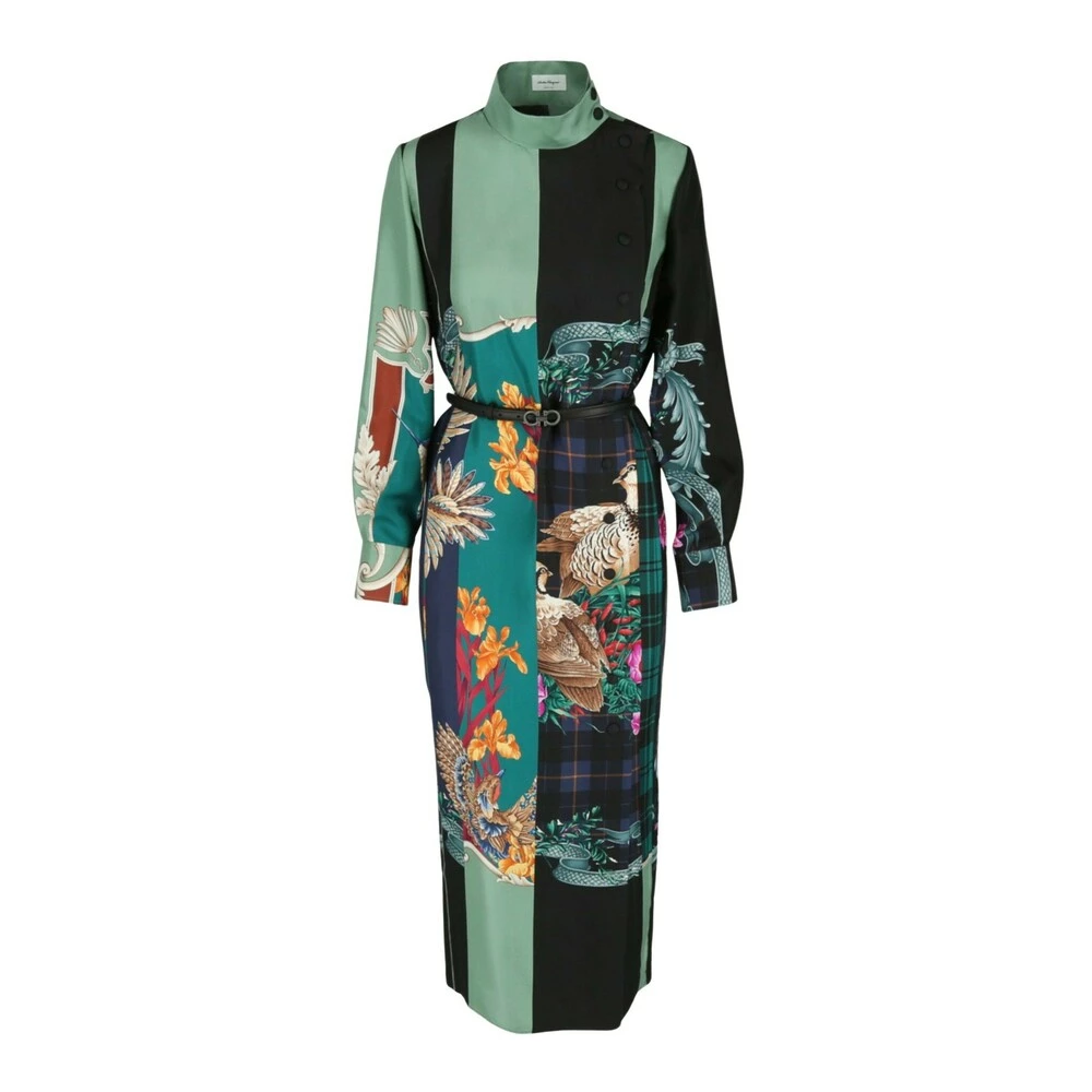 Front Snap Closure; Lange ermer, mandarin krage med sideknapplukking, mansjetter med knapper,; Gancini -logobelte i midjen, blandet skjerftrykk, Uforstilt; ; ;
