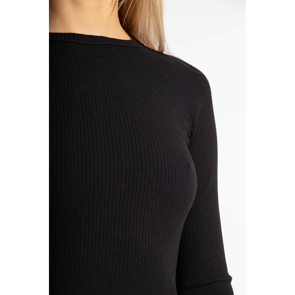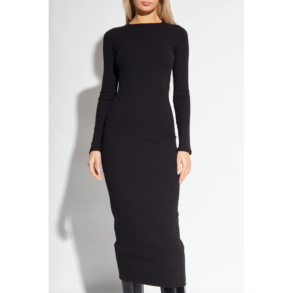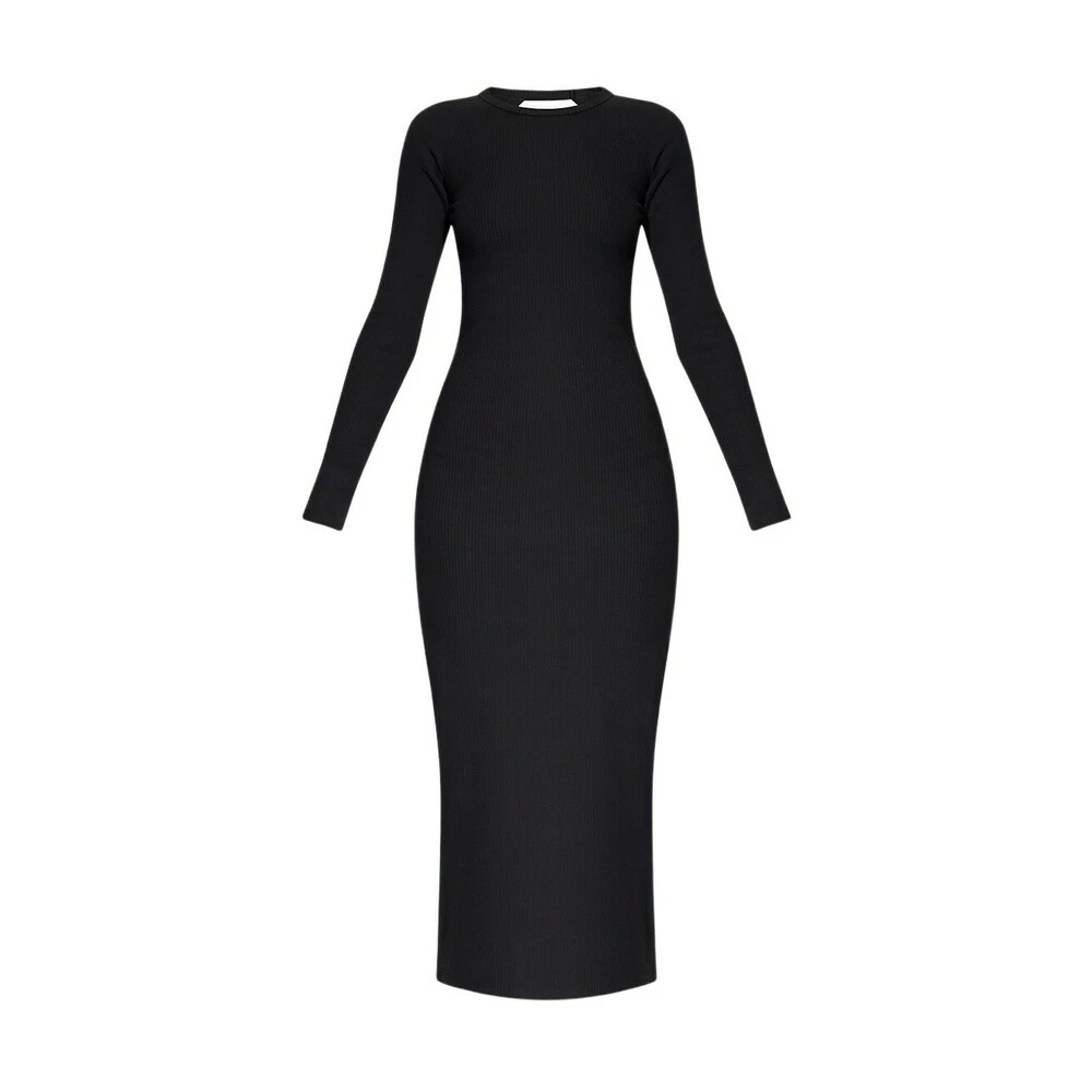 Svart ‘Helene’ ribbet kjole Samsoe Samsoe. Denne monterte designen er laget av en bomullsblanding, og har dekorative utskjæringer, rund nakke og lange ermer.