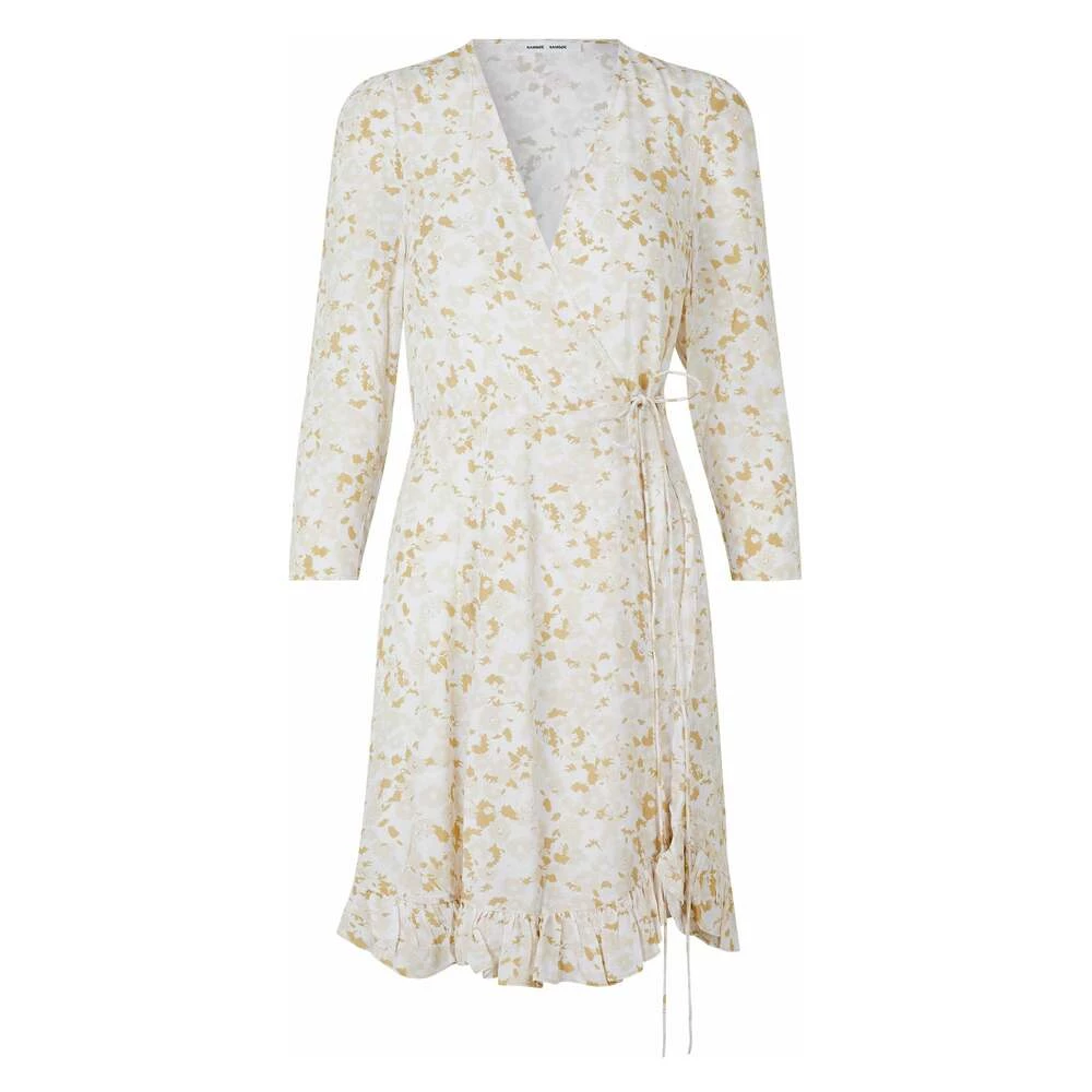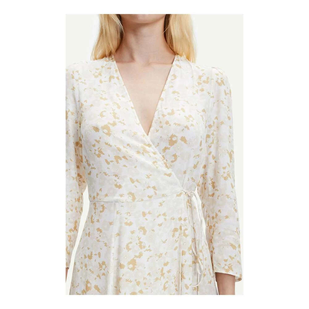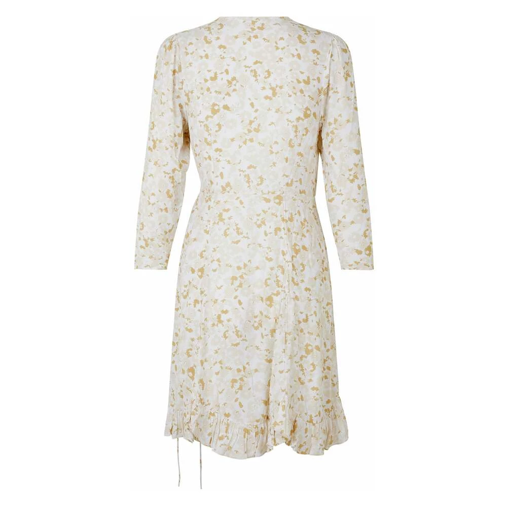 Janine Dress er en kort konvoluttkjole med blomstertrykk i beige nyanser. Kjolen har spiss utringning med knytet midjebelte, 3/4-ermer og en liten buffet på skuldrene.