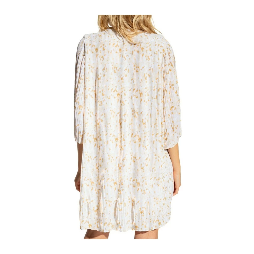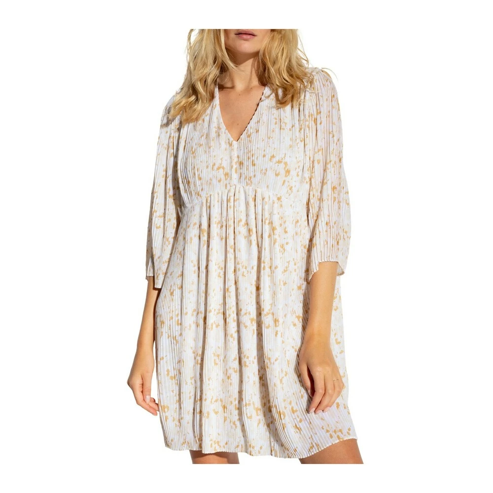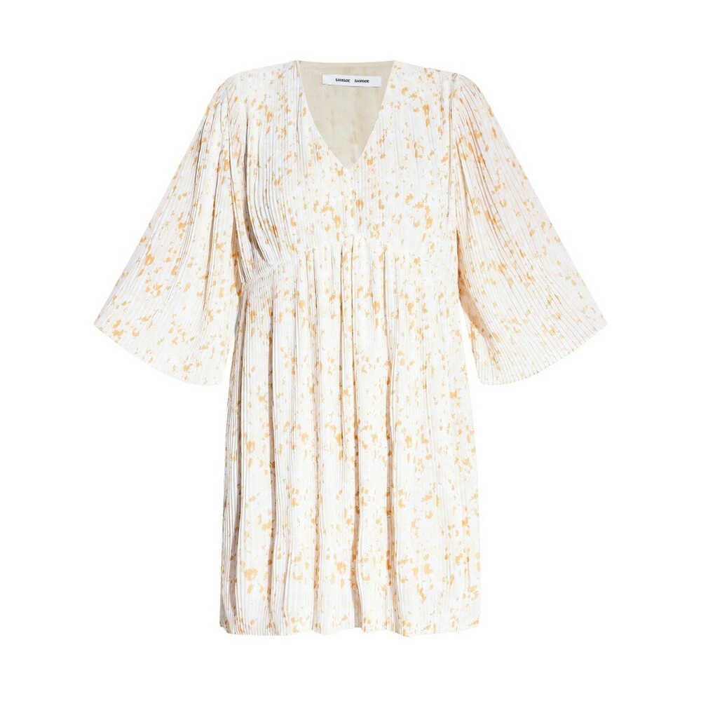 Krem, hvit og beige ‘skarlagen’ plissert kjole fra Samsoe Samsoe. Dette plagget er laget av resirkulerte materialer, og har en Empire-midje, et V-hals, lange ermer og blomstermotiv.