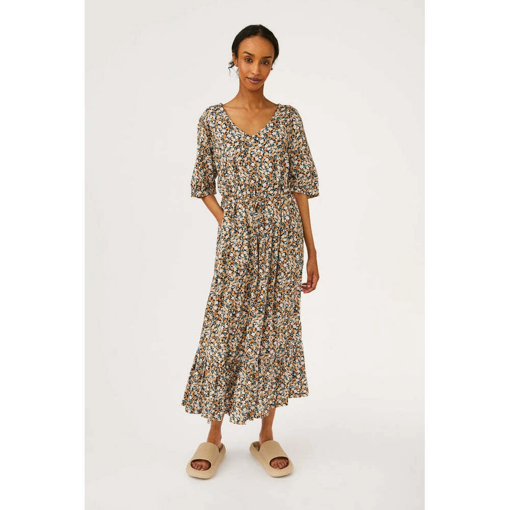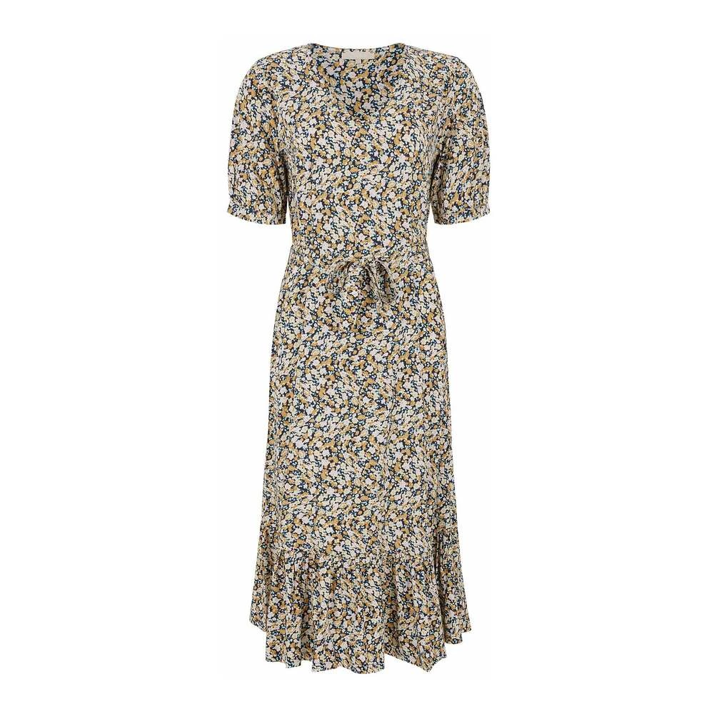 "SRNadja Midi Dress" fra Soft rebels. Nydelig kjole i deilig viskose kvalite med v-hals, knytebelte i midjen og volanger i bunnen. Normal i st�rrelsen. Laget av 97% viskose og 3% elastan.