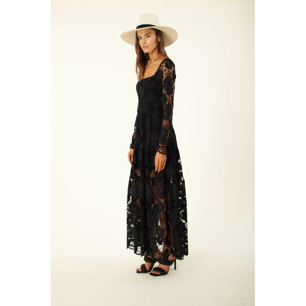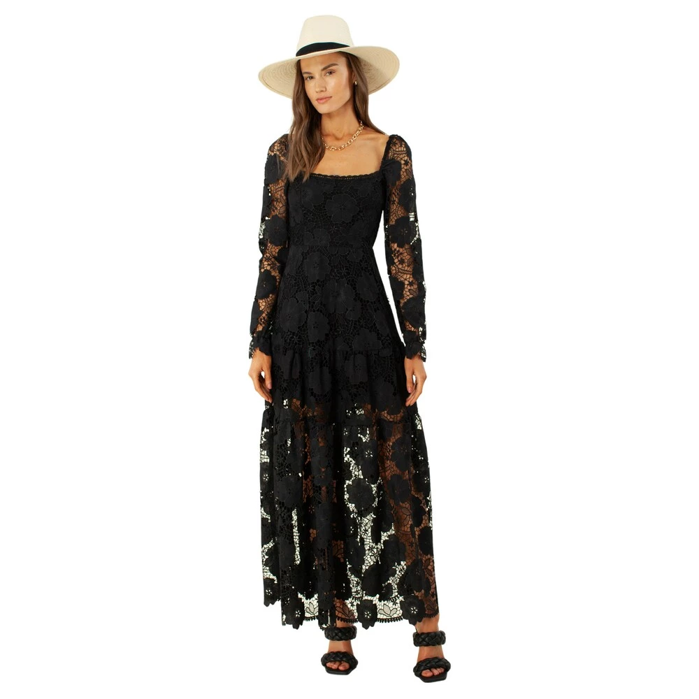 Navn : Hale Bob Saige Long Dress Farge : Sort Beskrivelse: Nydelig kjole med broderte blonder. Slim Fit med smocking og glidelås bak Langermet med strikk ved håndleddet. Foret. Midi lengde Materiale: Viskose/Spandex Jersey-fôr på kroppen