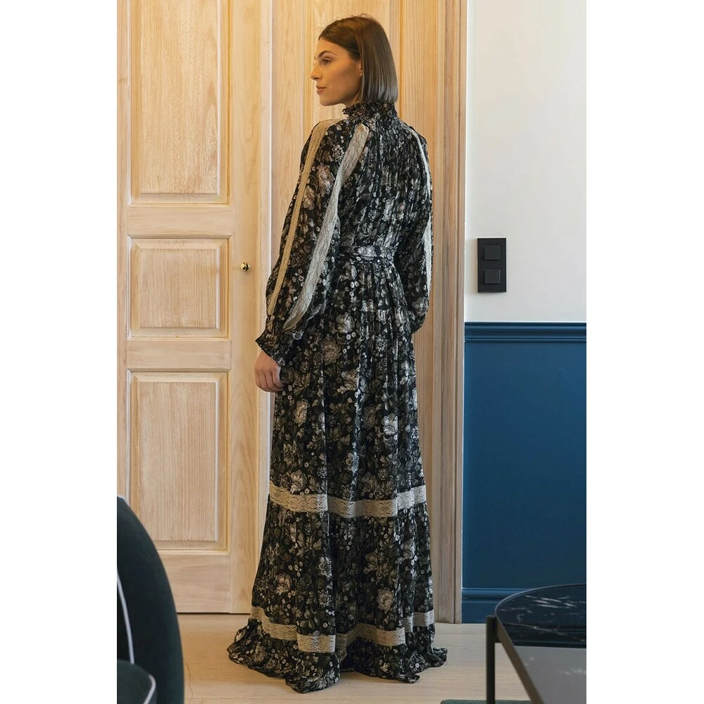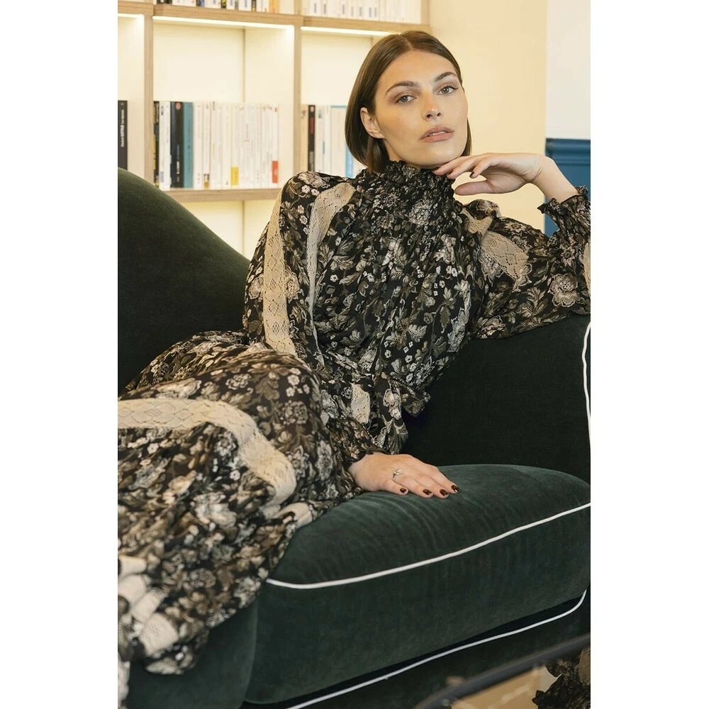 En lang og elegant kjole fra det fantastiske merket, Miss June. Helt nydelig mÞnster og fargekombinasjon; sort, khaki og mÞrk oliven. HÞy hals med elastikk. Vide raglan ermer med elastikk pÄ mansjettene. Blondedetaljer er gjentagende gjennom hele kjolen, som gjÞr den ekstra eksklusiv. Kan fint pyntes bÄde opp og ned. Materiale: 100% rayon onesize (36-44)