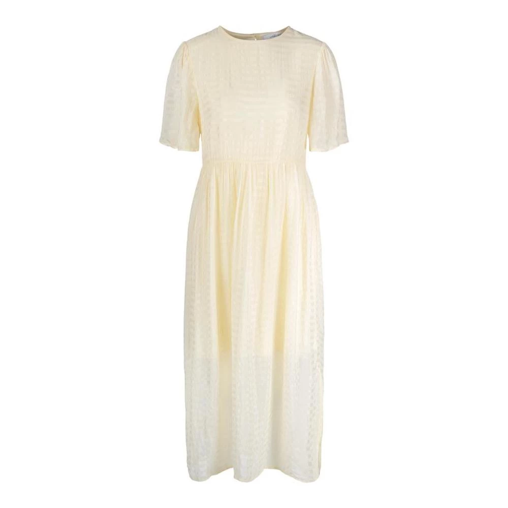 Det er skåret inn i et vakkert strukturert gjennomsiktig stoff og er ferdig med vide ermer og rynket detalj i midjen.